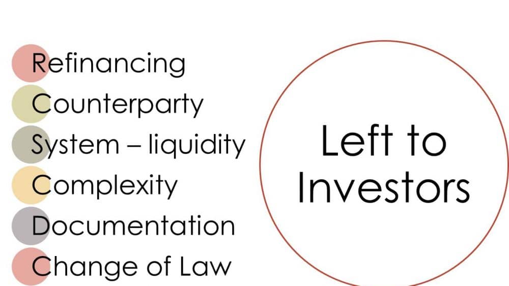 There are six main issues which need to be managed continuously by the board and management which rarely find their way into risk management plans or project documents. Refinancing, Counterparty, System Liquidity, Complexity and Change of Law.